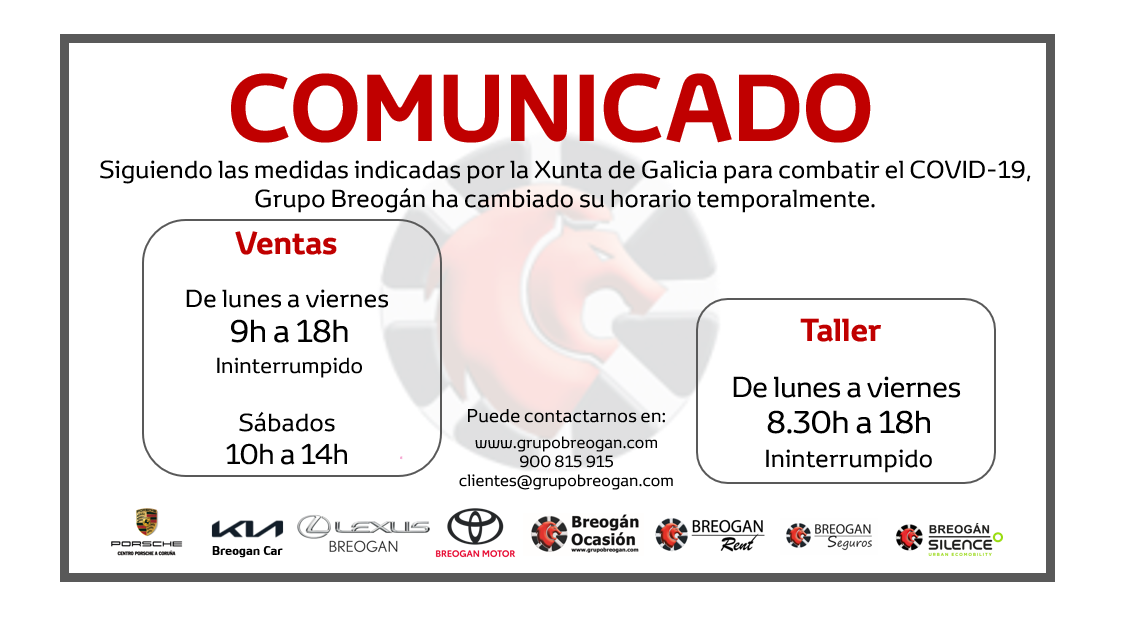 Desde el día 27 de enero hasta el próximo 17 de febrero, nuestros equipos de Postventa y Ventas de nuestros Centros Oficiales Toyota, Lexus, Kia, Porsche, Silence y Breogán Ocasión quedamos a su disposición para poder atenderle en el siguiente horario: