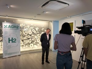 Esa misma tarde ha tenido lugar una entrevista para la cadena televisiva de Mediaset, en la que el gerente de la AGH2, explica en qué consiste el hidrógeno verde y sus ventajas como combustible alternativo.