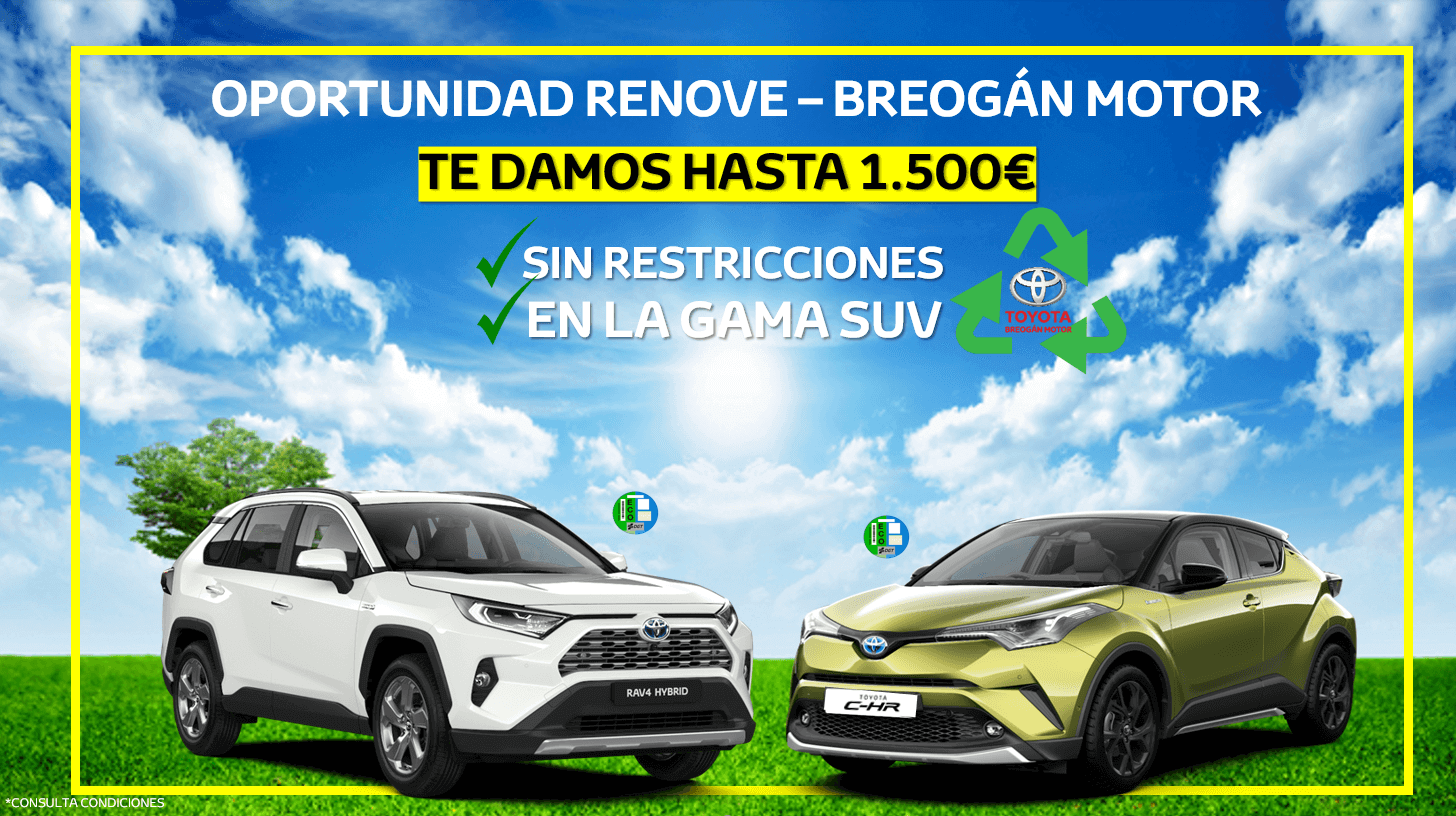 En Toyota Breogán Motor ofrecemos una Oportunidad Renove hasta 1.500€ de descuento sin restricciones, en la compra de tu nuevo CHR Hybrid y Rav4 Hybrid.