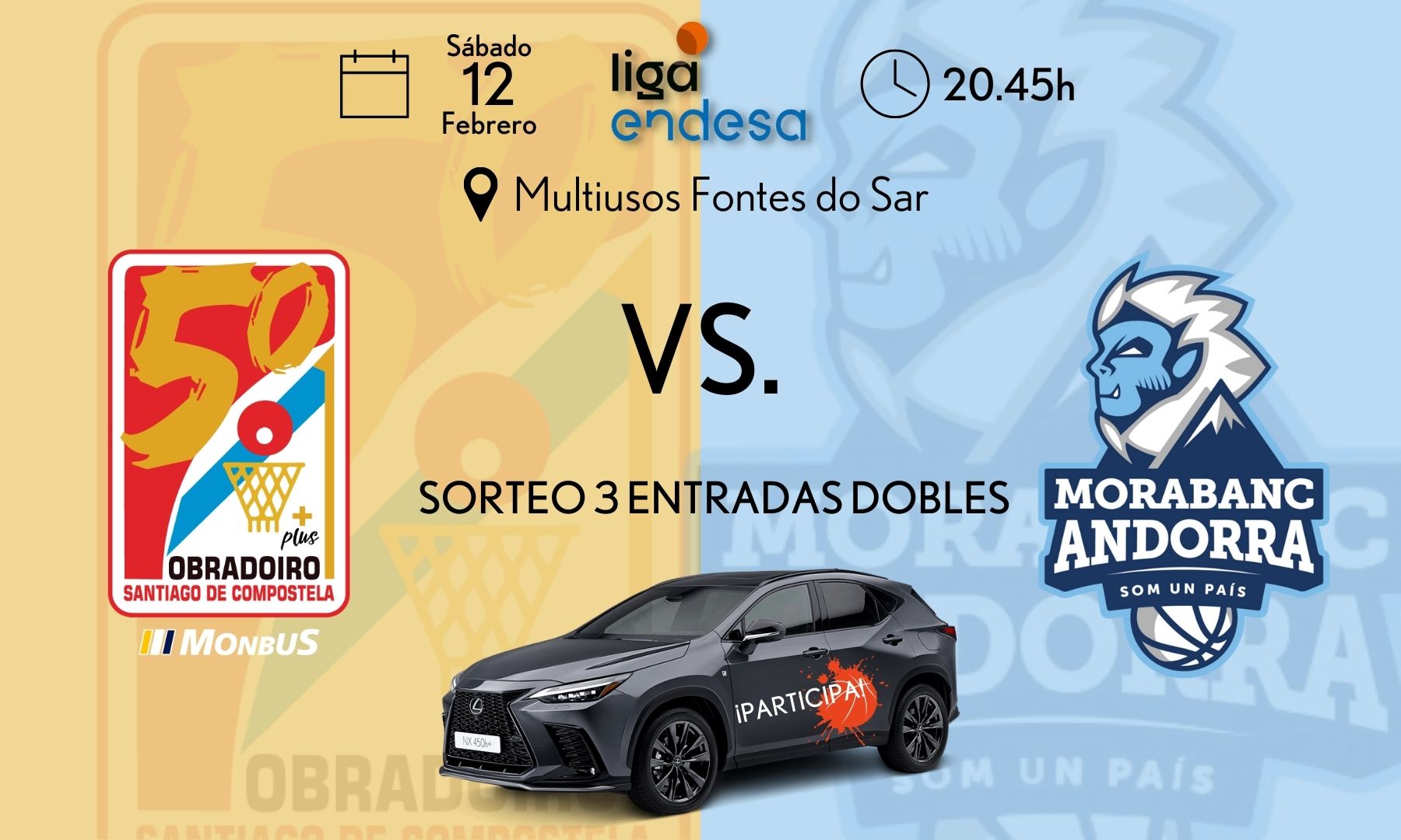 Lexus Breogán realiza un nuevo sorteo de tres entradas dobles para asistir al Multiusos Fontes do Sar de Santiago de Compostela para apoyar al Monbús Obradoiro.. El partido enfrentará al Monbús Obradoiro y al Morabanc Andorra este sábado 12 de febrero a las 20:45 h.