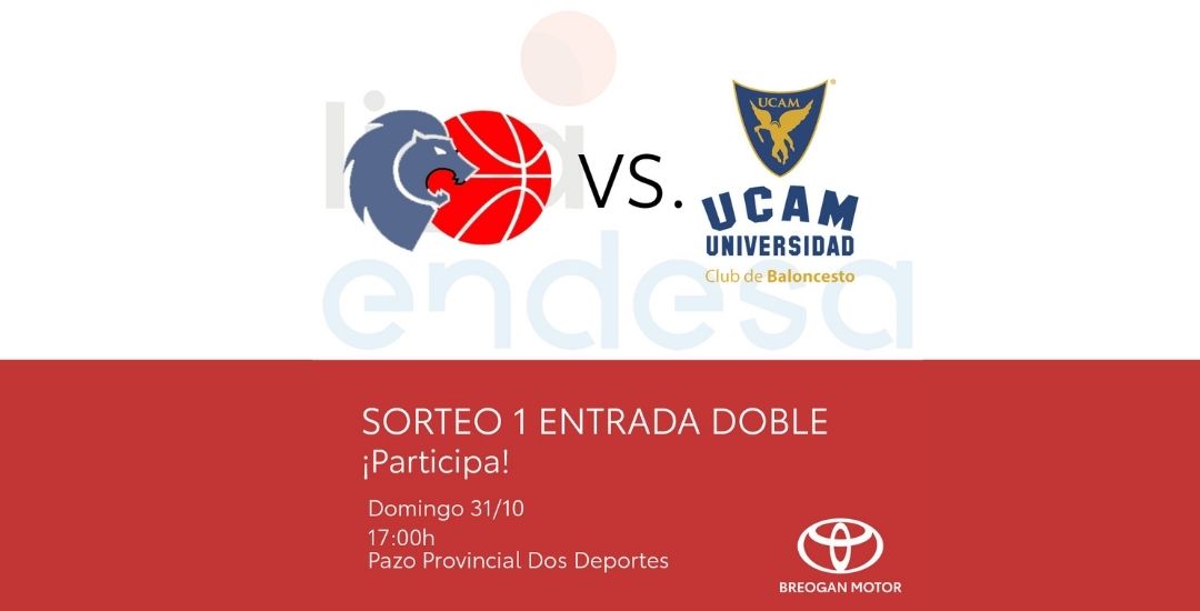 Toyota Breogán Motor sortea entre todos sus seguidores una entrada doble para el partido de la Liha Endesa ACB, Río Breogán vs. UCAM Murcia, que se celebrará este domingo 31 de octubre a las 17:00h en el Pazo Provincial Dos Deportes de Lugo.