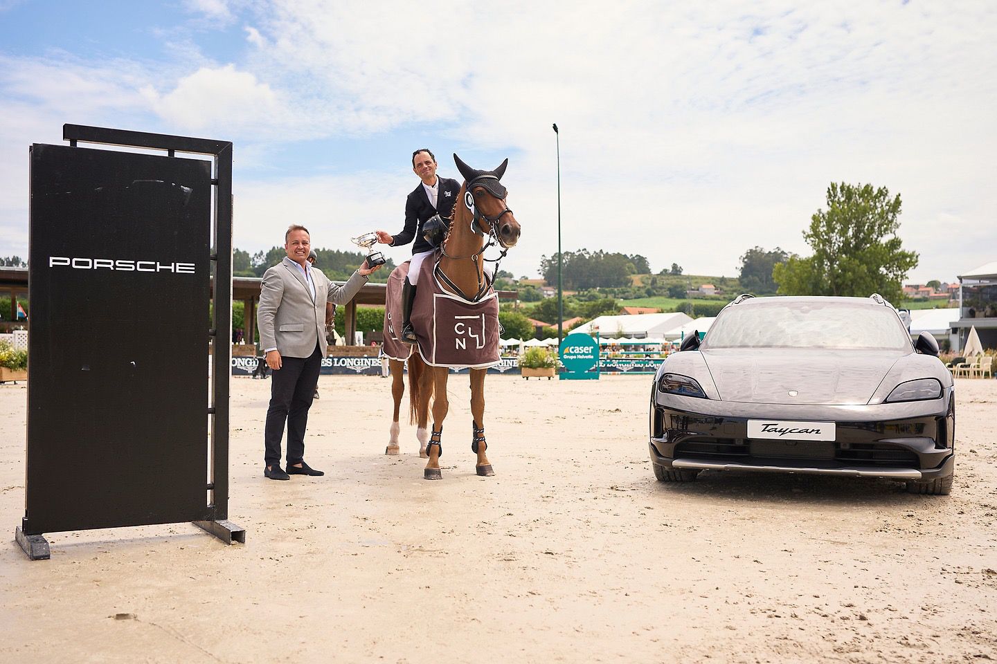 Jordi Curros, gerente de Centro Porsche A Coruña, entregaba el trofeo al vencedor, el jinete pontevedrés Javier González Fraga y su caballo, también español, Tik Tak de Pravia, que paraba el cronómetro a los 26.86 segundos tras un gran recorrido.
